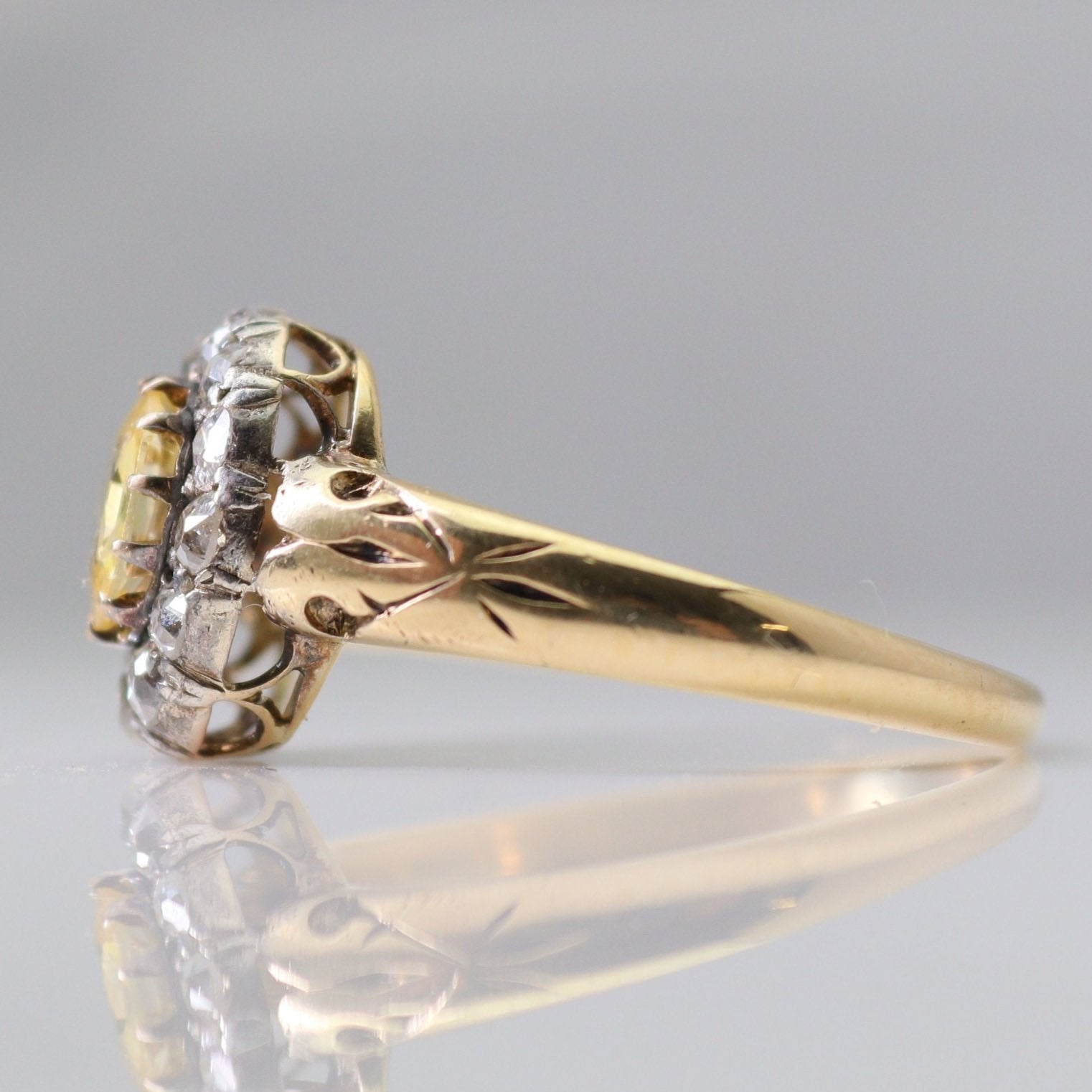 Claw set with an oval cut vibrant yellow sapphire, complemented by an outer cluster of twelve old cut diamonds measuring approximately .50 carat G colour and VS clarity. The sapphire measures approximately 1 carat. The Ring has a pierced out galley, and the shoulders have a scrolled, carved decoration leading to an 18 carat yellow gold plain band shank. The head of the ring measures 10mm in width. To the reverse the sapphire and diamonds are set into open backed settings, this allows the light to shine through.